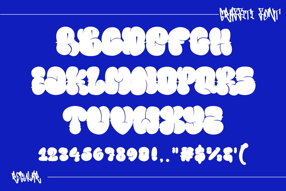Includes a full set of numbers and punctuation, ensuring flexibility for all design applications using this urban graffiti font.