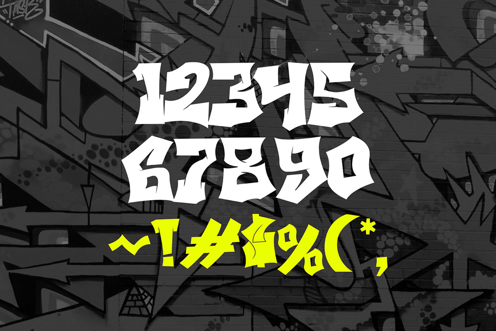 A complete set of numbers and punctuation ensures flexibility across various design applications using this urban graffiti font.